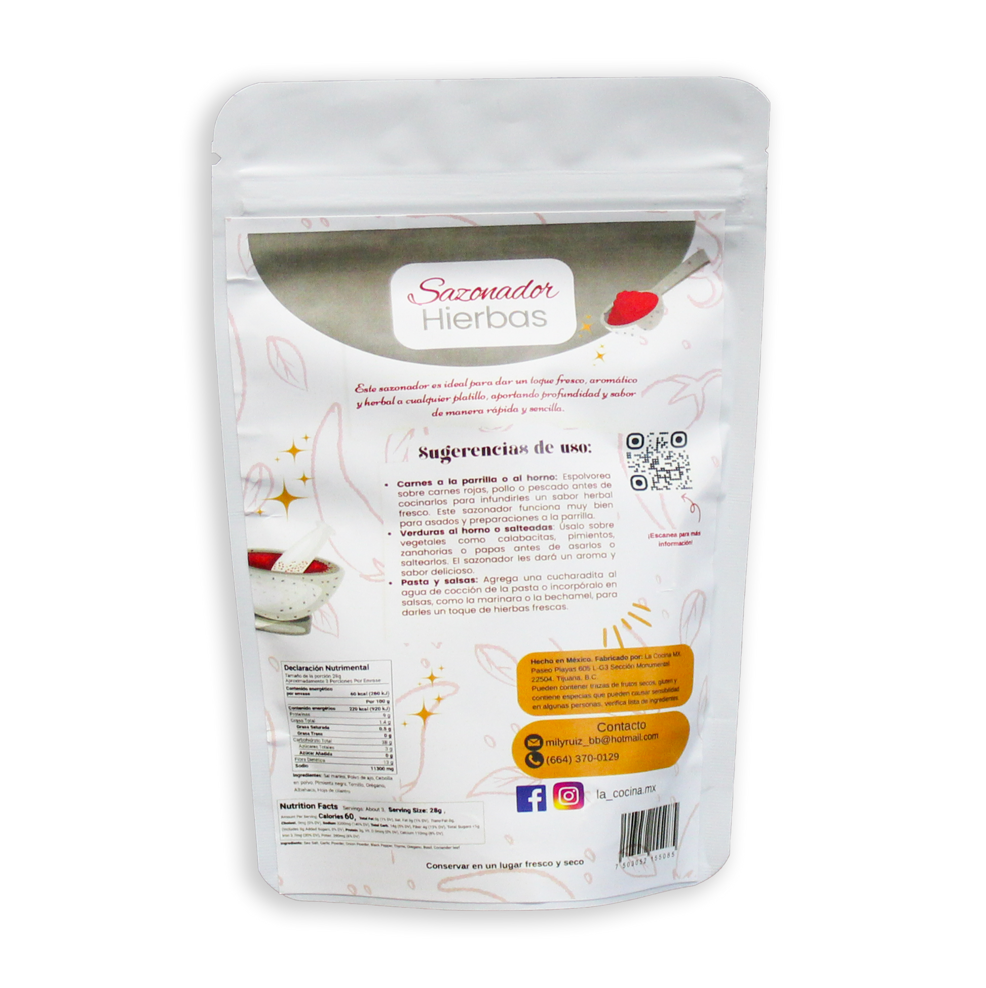 Sazonador artesanal de hierbas libre de conservadores y colorantes.